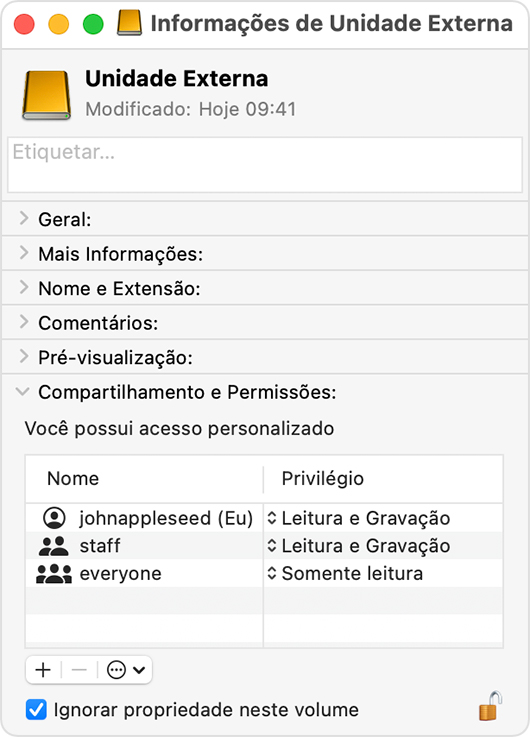 Certifique-se de que o dispositivo de armazenamento externo, como uma unidade USB ou Thunderbolt, esteja formatado para Mac: APFS ou Mac OS Expandido (Journaling).