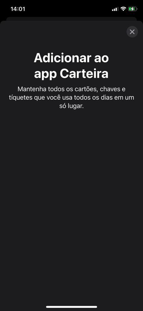 meu app carteira não adiciona cartão. quando eu clico em adicionar aparece a seguinte frase "Adicionar ao app carteira mantenha todos os cartões, chaves e tíquetes que você usa todos os dias em um só lugar", porem não dá opção de adicionar nada. alguém já teve esse problema ?