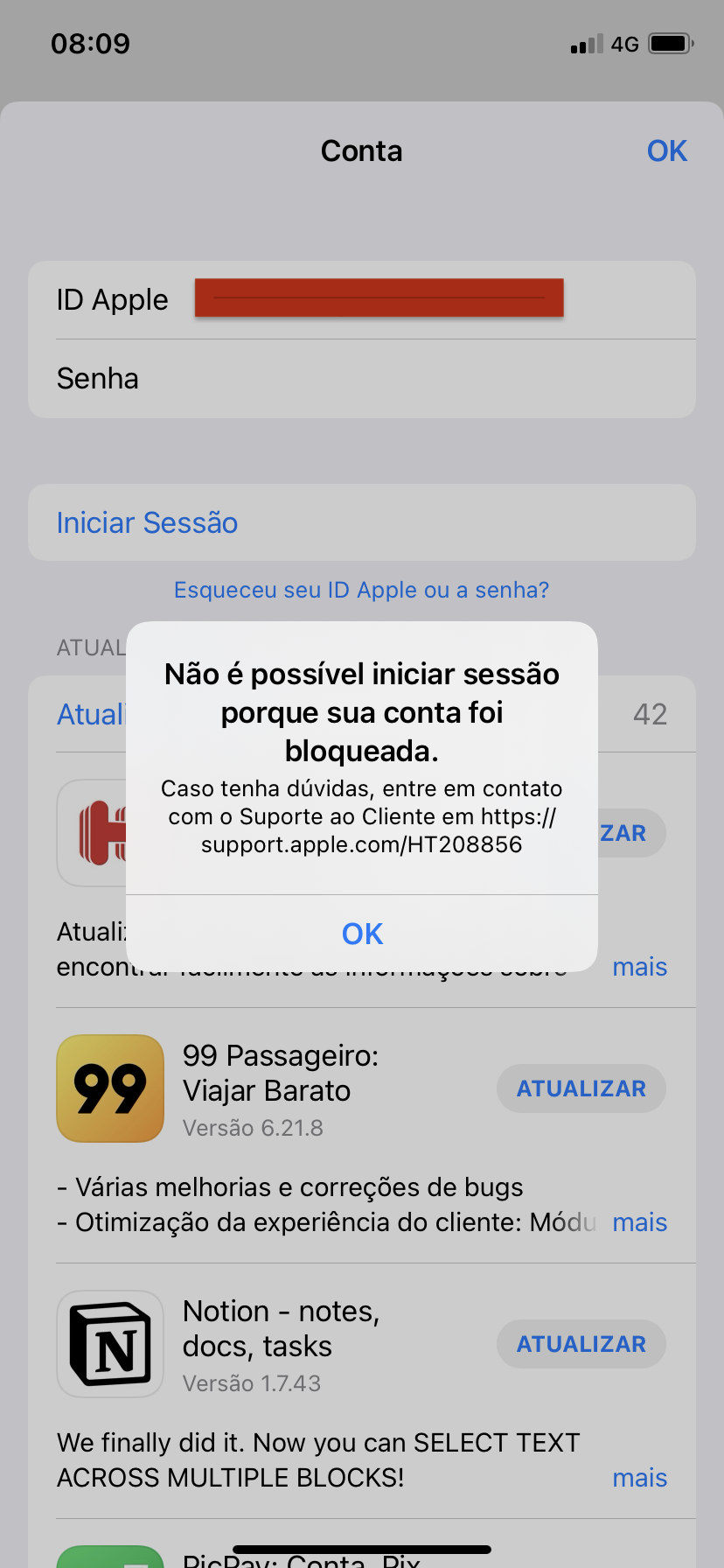 Minha conta da app store esta bloqueada e nao sei o motivo e nem o que aconteceu. Nao consigo fazer nada, nem atualizar uma app