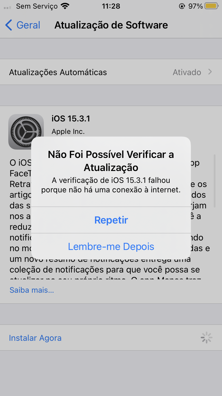 Pode tentar Reiniciar o iPhone, o modem ou roteador da rede. Se ainda não resolver, pode tentar os artigos Se o iPhone, iPad ou iPod touch não atualizar e Se não for possível atualizar nem restaurar o iPhone ou iPod touch. A recomendação é fazer backup antes.