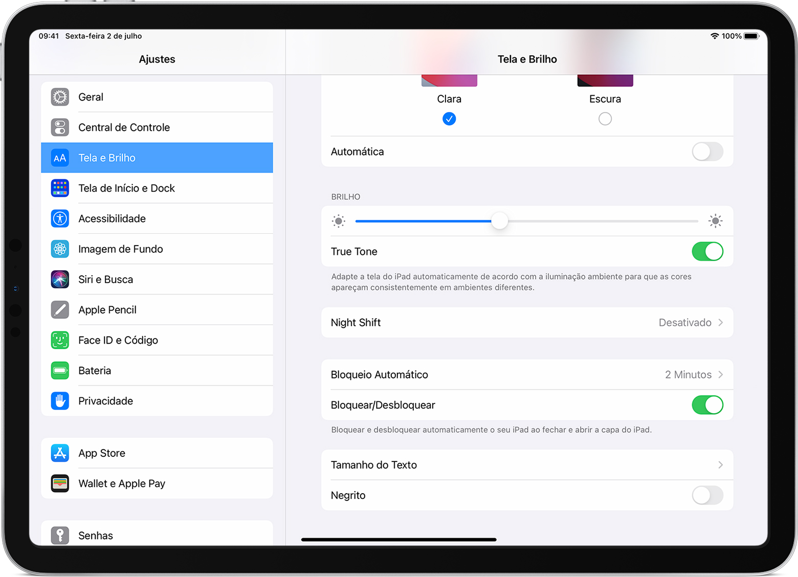 Se o iPad não despertar nem entrar em repouso ao abrir e fechar a capa, acesse Ajustes > Tela e Brilho e ative a opção Bloquear/Desbloquear.