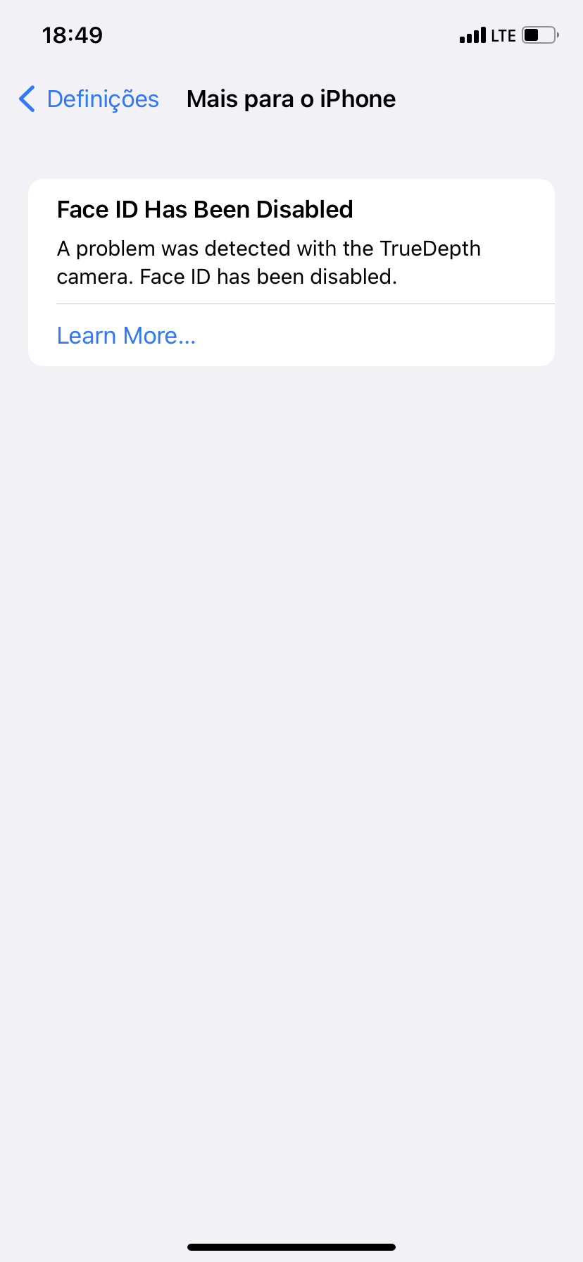 "Foi detectado um problema com a câmera TrueDepth. O Face ID foi desativado."