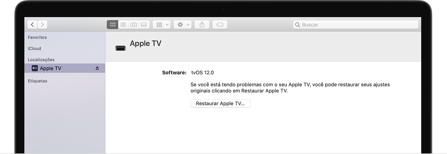 - Clique em "Restaurar Apple TV". Enquanto a restauração estiver em andamento, não desconecte os cabos. O tempo necessário para a restauração da Apple TV depende da velocidade da conexão com a Internet.