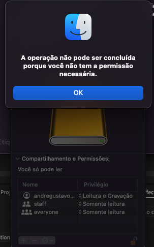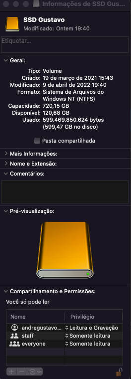 Estou com um problema no meu macbook air 2020, onde eu conecto meu hd externo no meu hub, aparece o hd, consigo acessar ele mas não consigo salvar nada, consta que posso apenas ler.