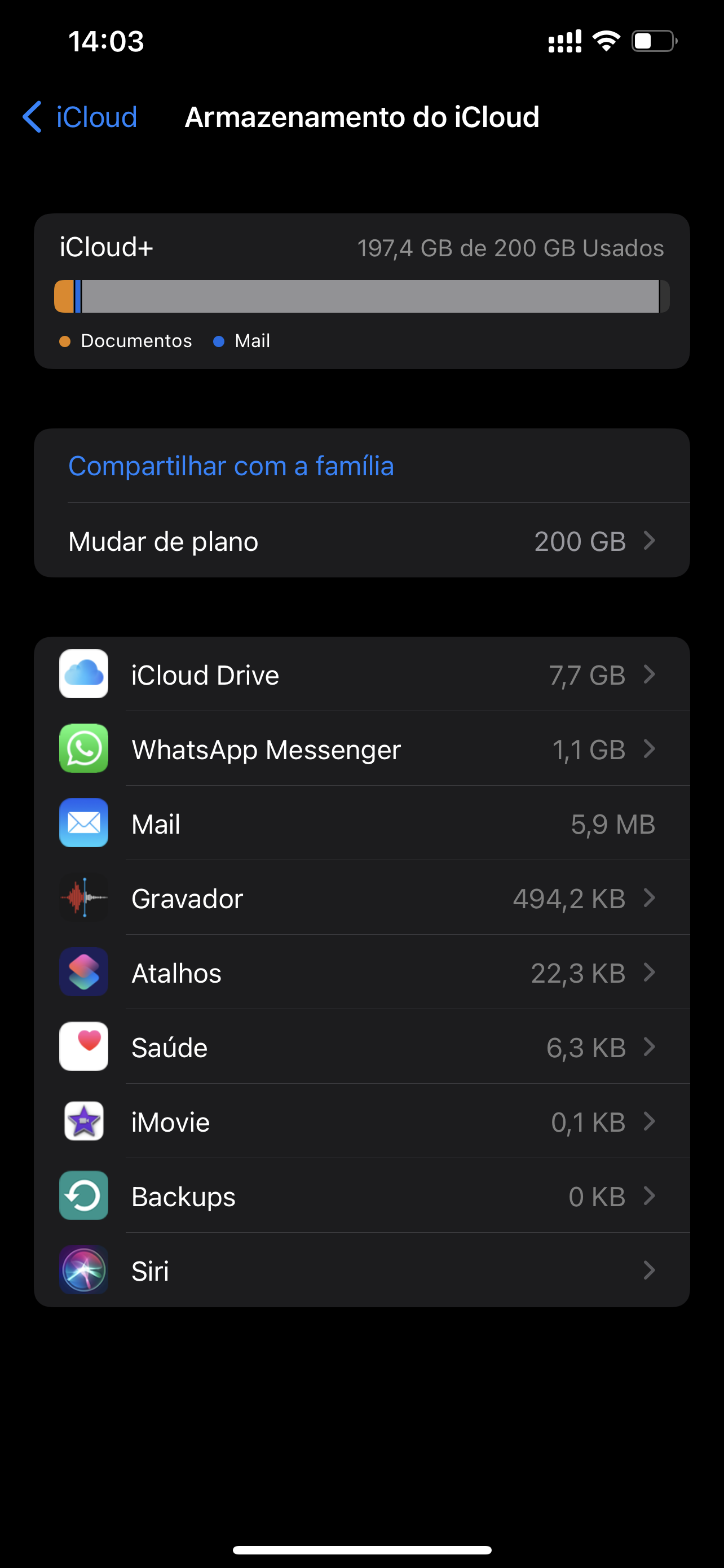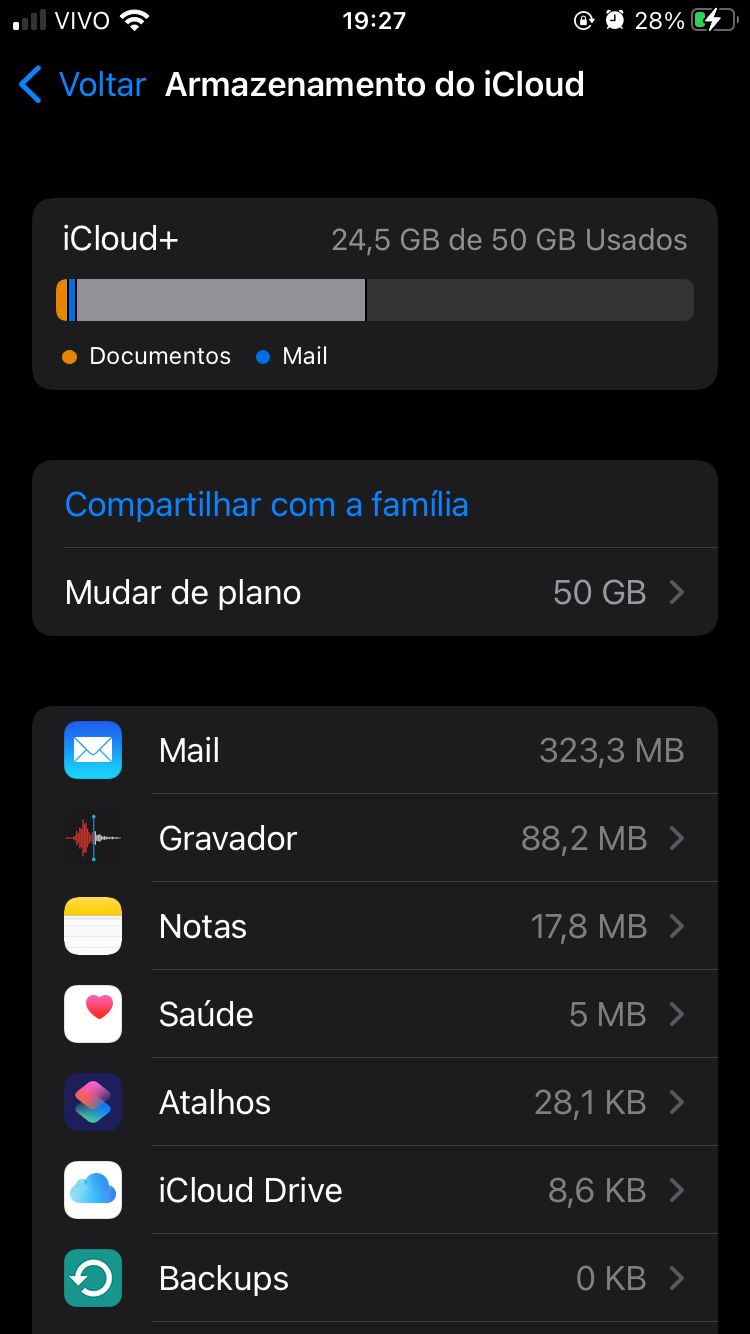 Comprei hoje 50gb de espaço extra no icloud. Havia somente 1gb ocupad.o Algum backup automatico aconteceu e tenho agora 25gb ocupados, porem nao consigo saber que arquivos sao esses, pois na barra aparece uma grande cor cinza, sem mostrar qual app está ocupando o espaço. Alguma solução?