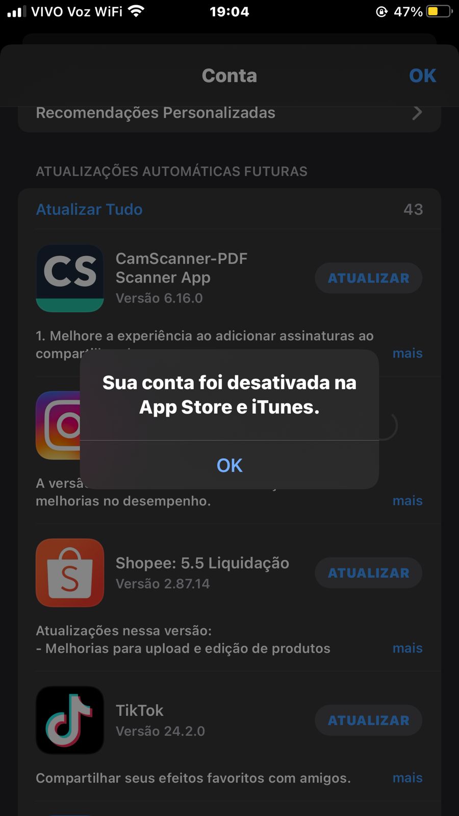 bom qdo eu vou atualizar algum app ou instalar aparece a seguinte frase “Sua conta foi desativada na App Store e iTunes” o q eu devo fazer??