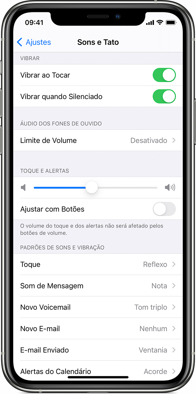Se você deseja controlar o volume de toque e alertas separadamente dos outros apps, desative a opção "Ajustar com Botões". Então, ajuste o volume de toque e alertas manualmente em Ajustes > Som e Tato ou Ajustes > Som.