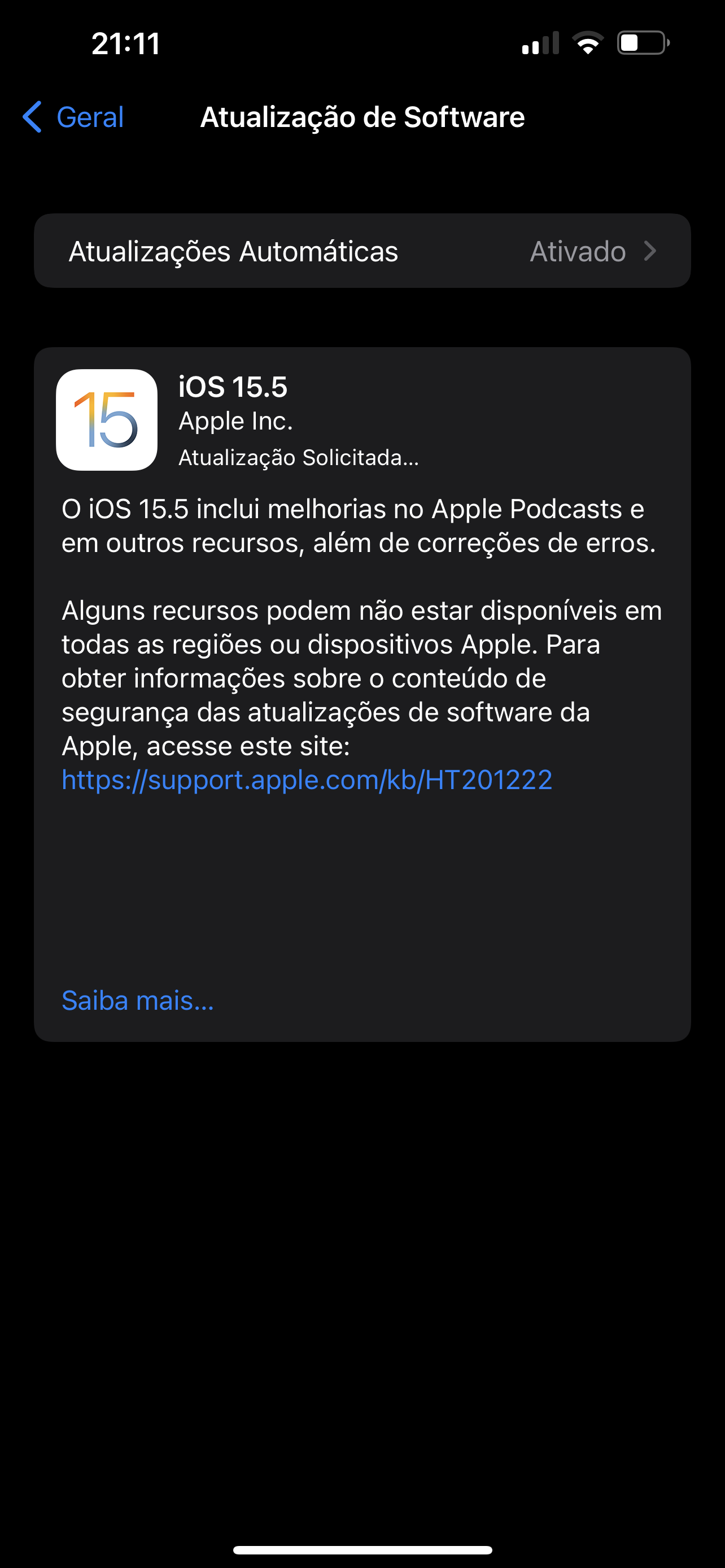 Última atualização não está disponível para o meu iPhone 13