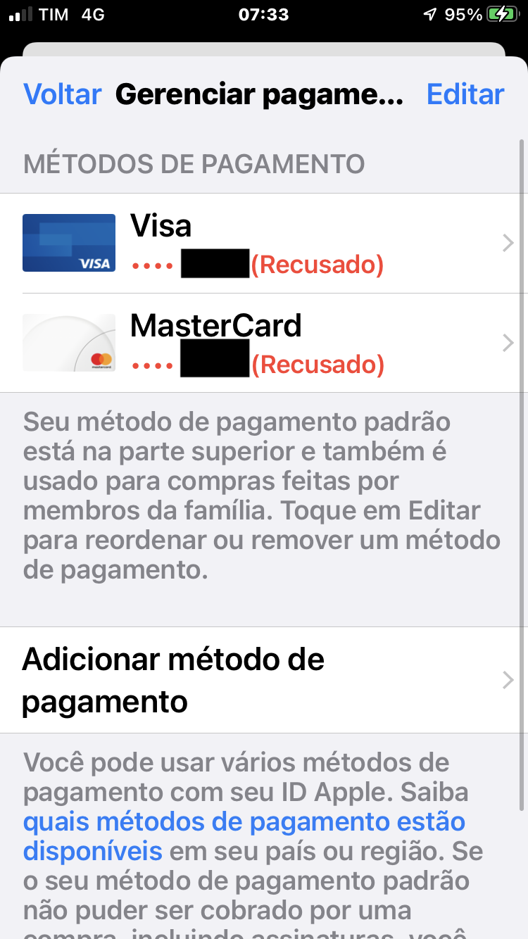 Estou problemas não consigo add cartões de banco algum e todos são recusados o que está havendo, cartão internacional e cartão de minha conta corrente também