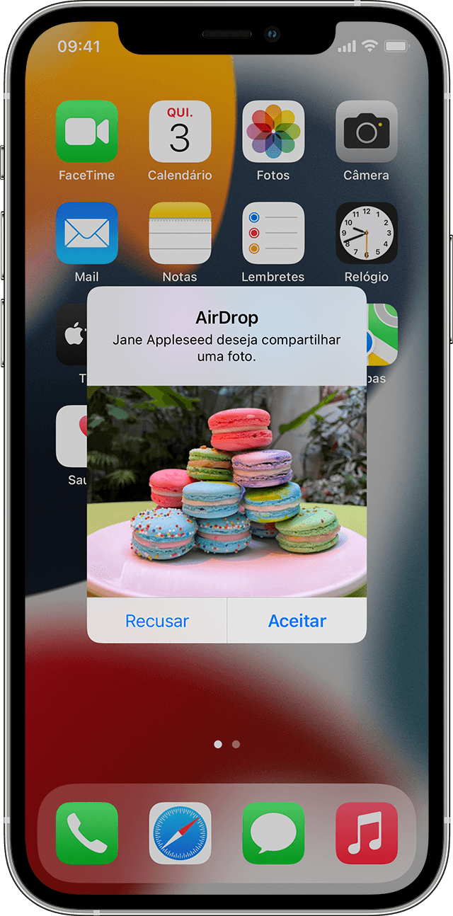 Quando alguém compartilha algo com você usando o AirDrop, um alerta com uma pré-visualização é exibido. Você pode tocar em Aceitar ou Recusar.
