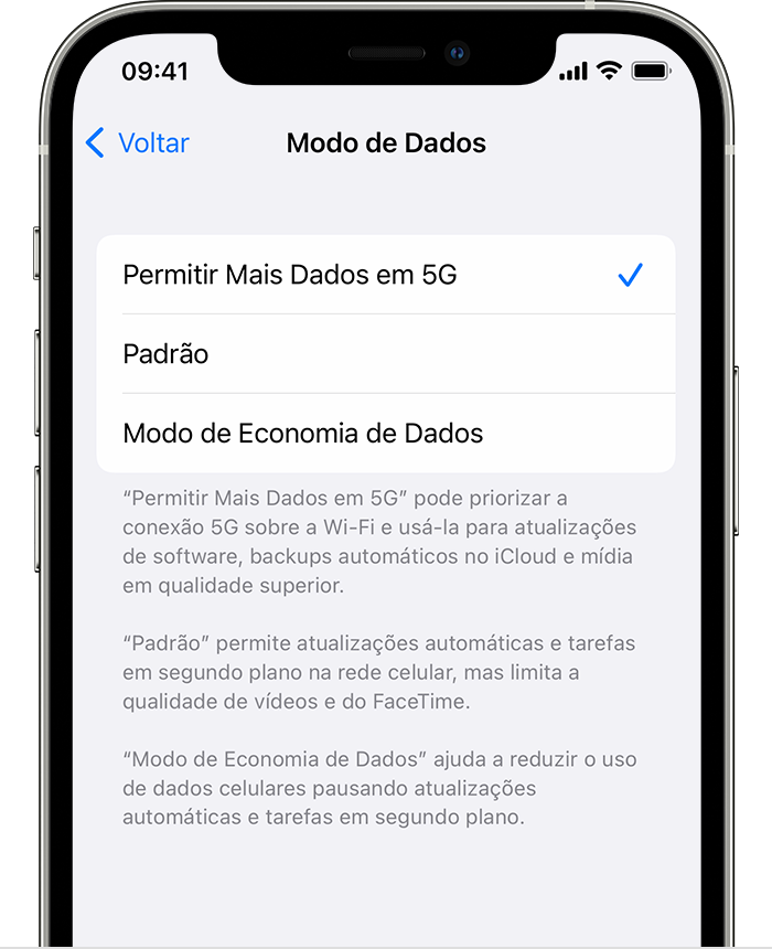 • Padrão: permite atualizações automáticas e tarefas em segundo plano pela rede celular e usa ajustes de qualidade padrão de vídeo e FaceTime. Geralmente, é o modo padrão.