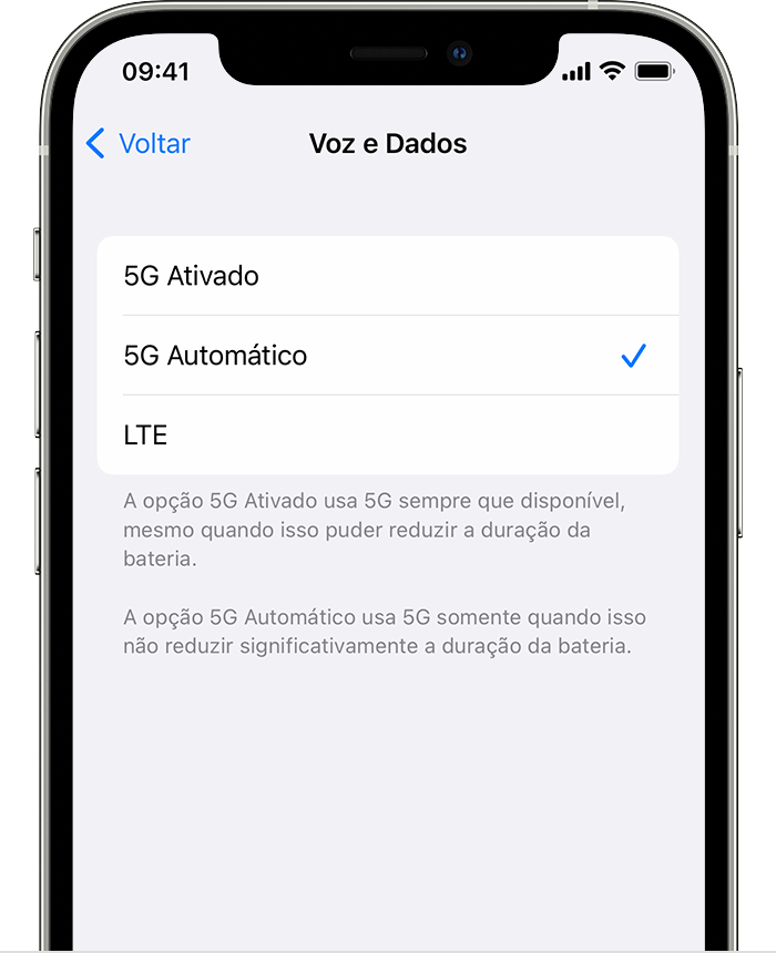 • 5G Automático: ativa o Modo de Dados Inteligentes. Quando a velocidade da rede 5G não proporcionar uma experiência perceptivelmente melhor, o iPhone mudará automaticamente para a rede LTE para aumentar a duração da bateria.