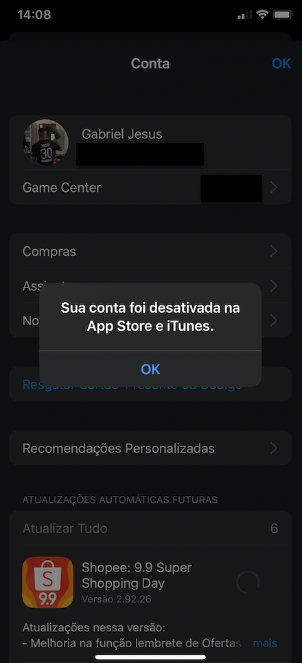 Mensagem de que App Store e iTunes estão desativados