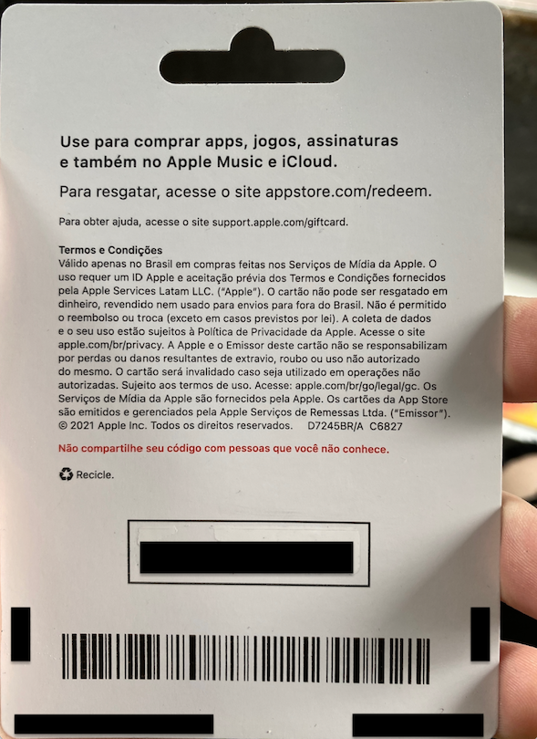 Se você não conseguir ler o código no verso do cartão por estar arranhado ou danificado, entre em contato com o Suporte da Apple.