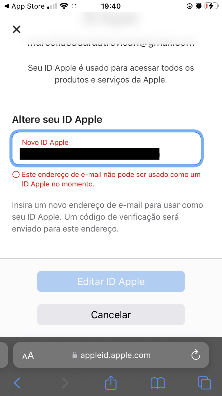 Não consigo alterar meu e-mail @gmail.com para @icloud.com