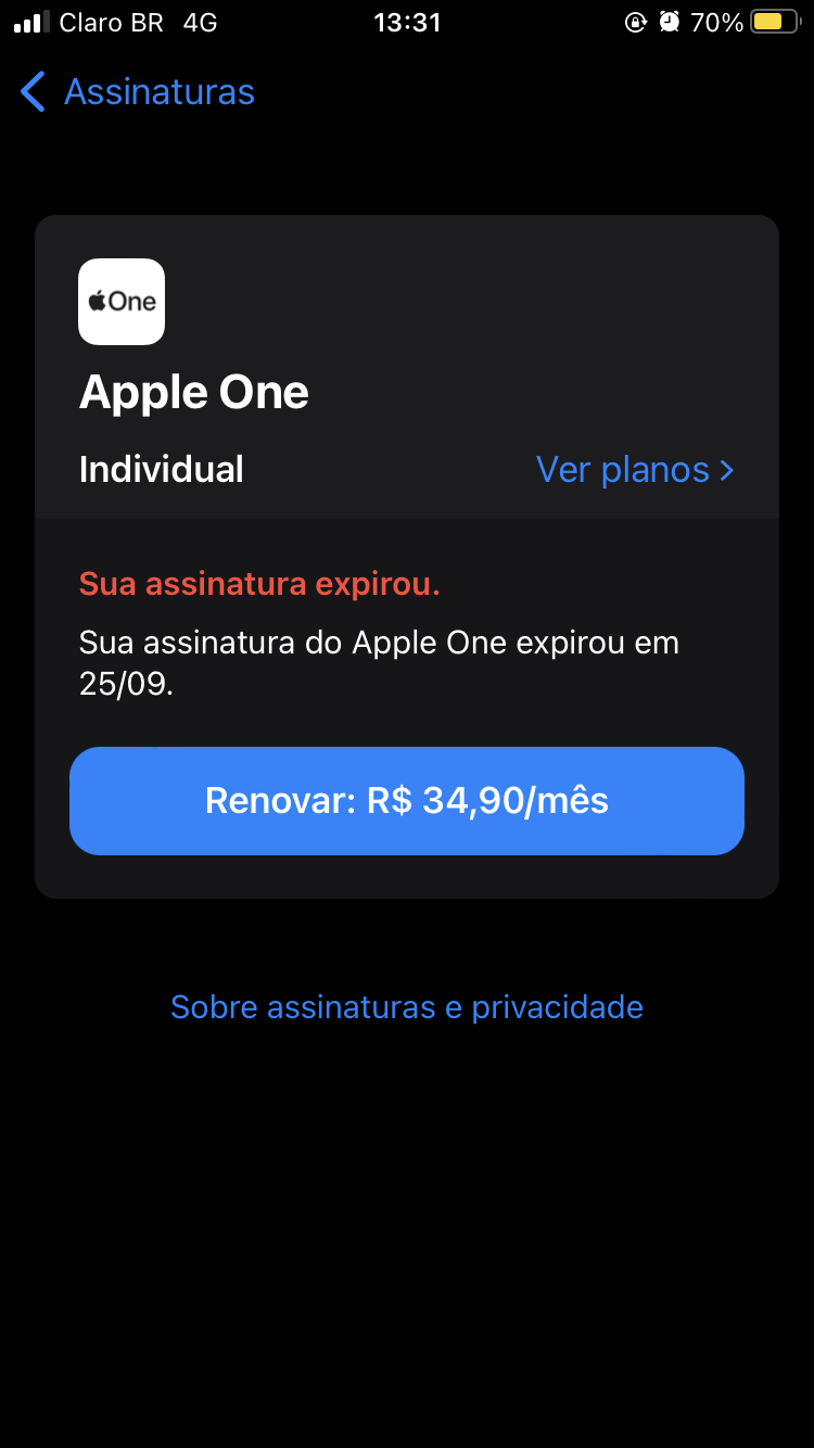 assinei periodo teste com apple one, mas desejo cancelar, porém a opção de cancelar não aparece oque devo fazer. OBS: a assinatura ja foi expirada.
