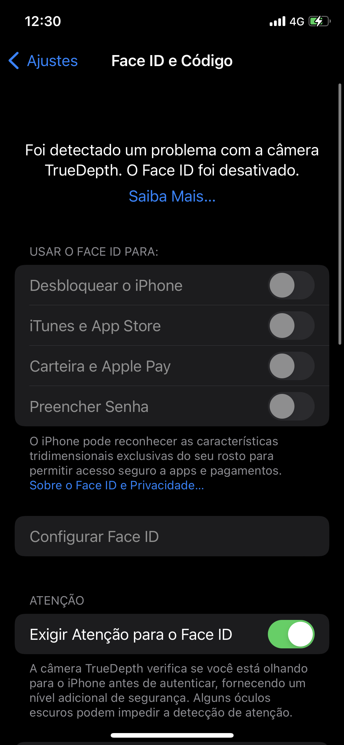 Já atualizei versão, reiniciei aparelho, redefini o Face ID não disponível para configurar novamente , e permanece com msgm de problema com a caneta TrueDepth é que o Face ID foi desativado, como devo proceder por gentileza ?