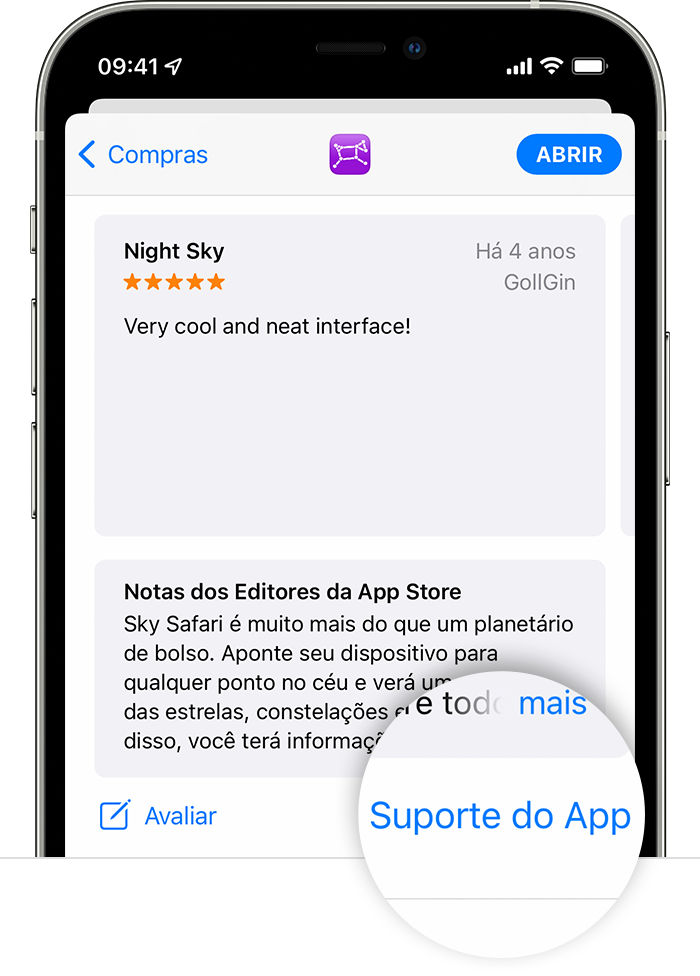 A página do produto do app será exibida. Role até a seção "Classificações e avaliações" e toque em "Suporte do App". Se essa opção não estiver disponível, verifique se você iniciou sessão com o ID Apple correto.