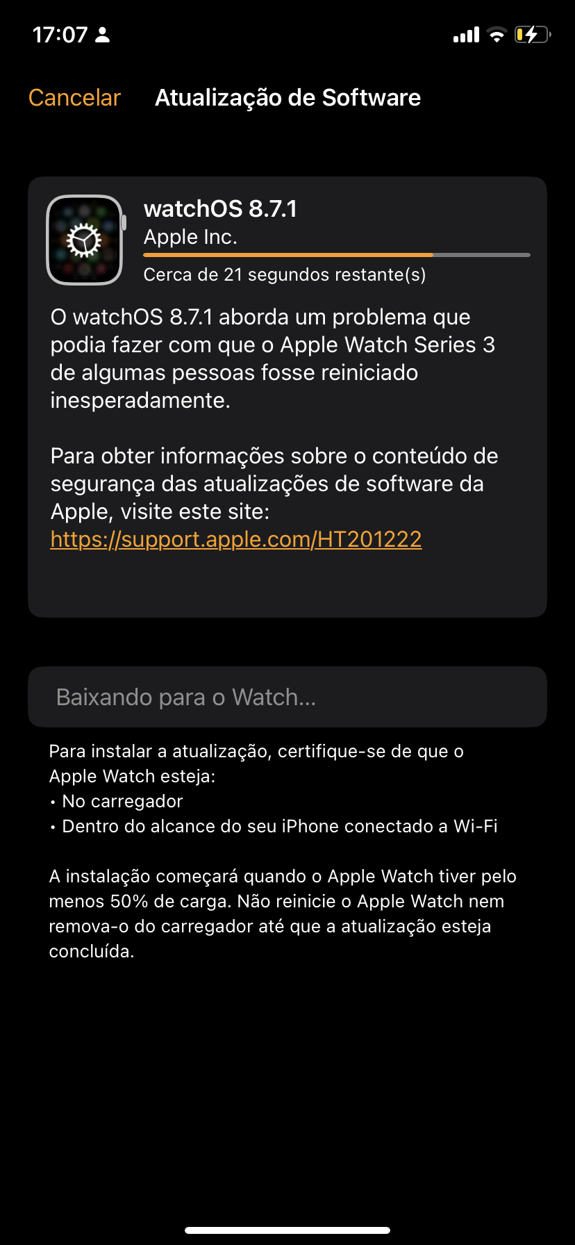 o Apple Watch está desemparelhado do iPhone, quando coloco para emparelhar ele fala que precisa atualizar primeiro, coloco para atualizar e não vai conforme as fotos que mandei