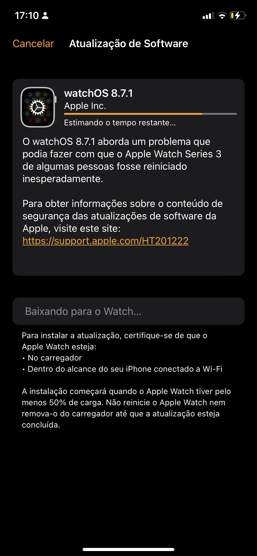 Reinicie o Apple Watch, verifique se ele está conectado à Internet e tente atualizá-lo novamente.