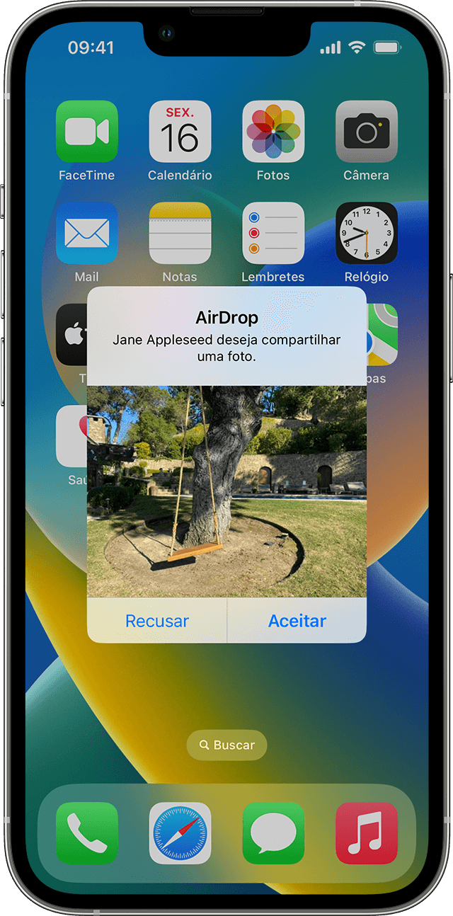 Quando alguém compartilha algo com você usando o AirDrop, um alerta com uma pré-visualização é exibido. Você pode tocar em Aceitar ou Recusar.