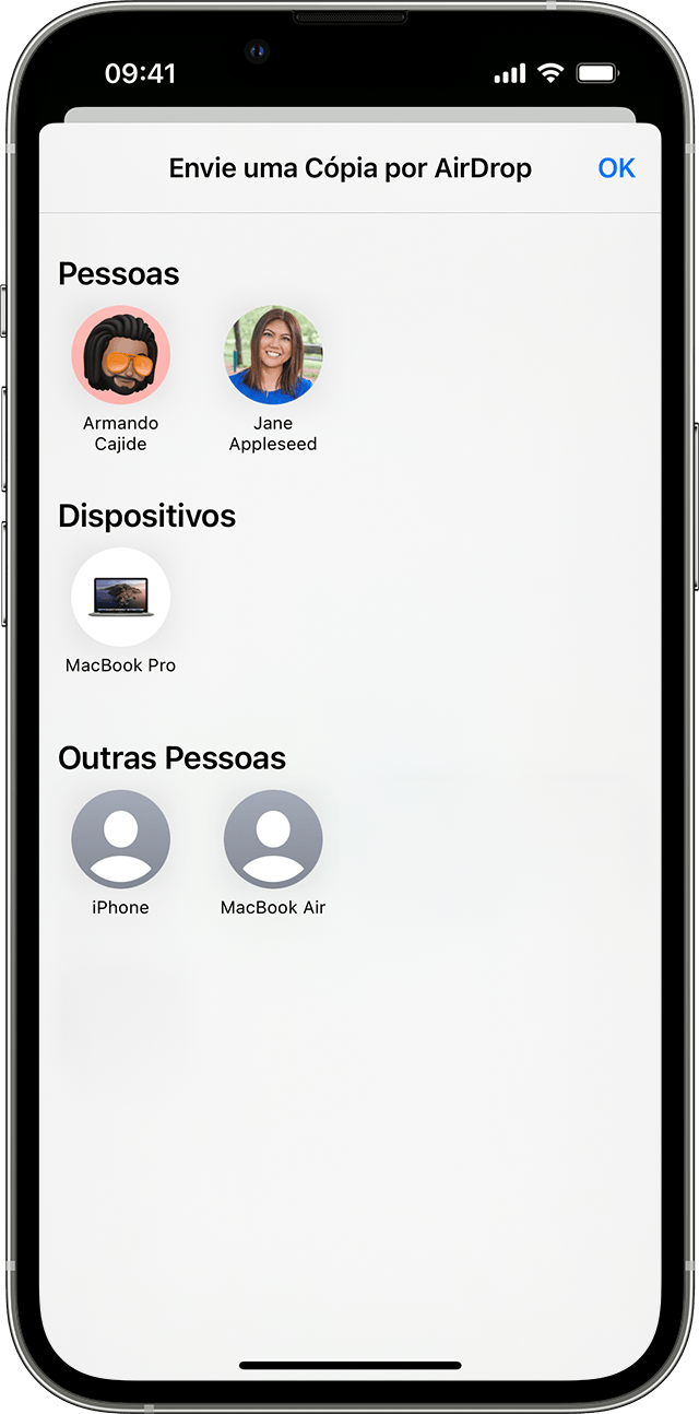 A opção Apenas Contatos está disponível em dispositivos compatíveis com iOS 10 e posterior, iPadOS ou macOS Sierra 10.12 e posterior. Se o AirDrop estiver definido como Apenas Contatos no seu dispositivo com uma versão de software anterior, você precisará ajustar as configurações do AirDrop para a opção Todos em Ajustes ou na Central de Controle. Você pode selecionar a opção Todos enquanto estiver usando o AirDrop e desativá-la quando não estiver em uso.