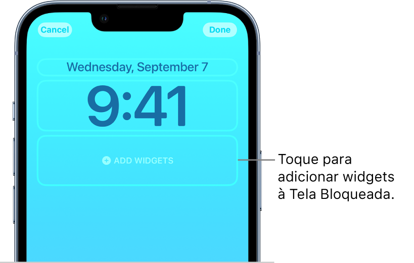 Dica: no iPhone 14 Pro e iPhone 14 Pro Max, você pode manter a Tela Bloqueada ligada para vê‑la a qualquer momento e conferir a data, as horas e as informações dos widgets. Consulte Mantenha a Tela Bloqueada visível com o ajuste Tela Sempre Ativada.