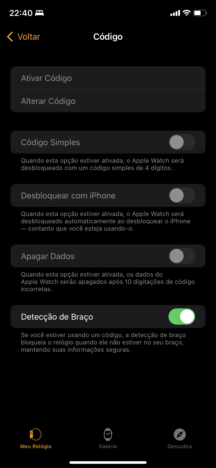 Pessoal, o item de código do meu Apple Watch não está habilitado, com isso o relógio não faz o bloqueio automático e não consigo alterar o código.