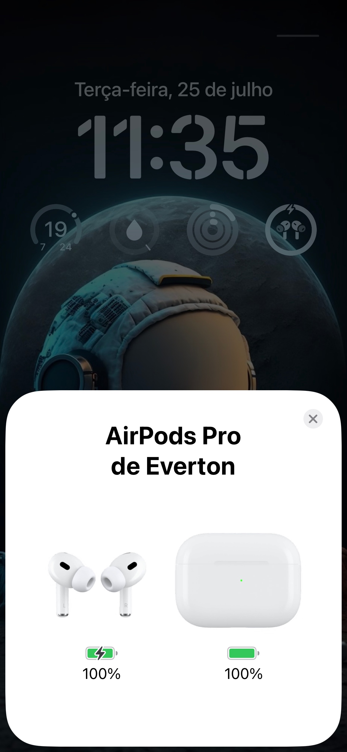 No mesmo sábado, depois de um tempo usando, coloquei para carregar, e às 19:37, ambos (estojo e fones) estavam com 100%. Foi a partir daí que percebi o estojo descarregar "sozinho". Absolutamente do nada! Enquanto eu usava os AirPods. Então, ontem, às 19:05, o estojo atingiu 20%. Foi aí que coloquei para carregar! Assim que atingiu 100%, removi do carregador!