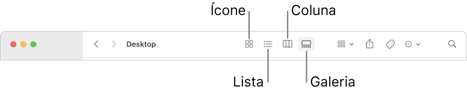 - Na barra de ferramentas do Finder, clique em um botão de Visualização (os botões podem estar em uma janela local; para mostrá-los em uma linha, alargue a janela).