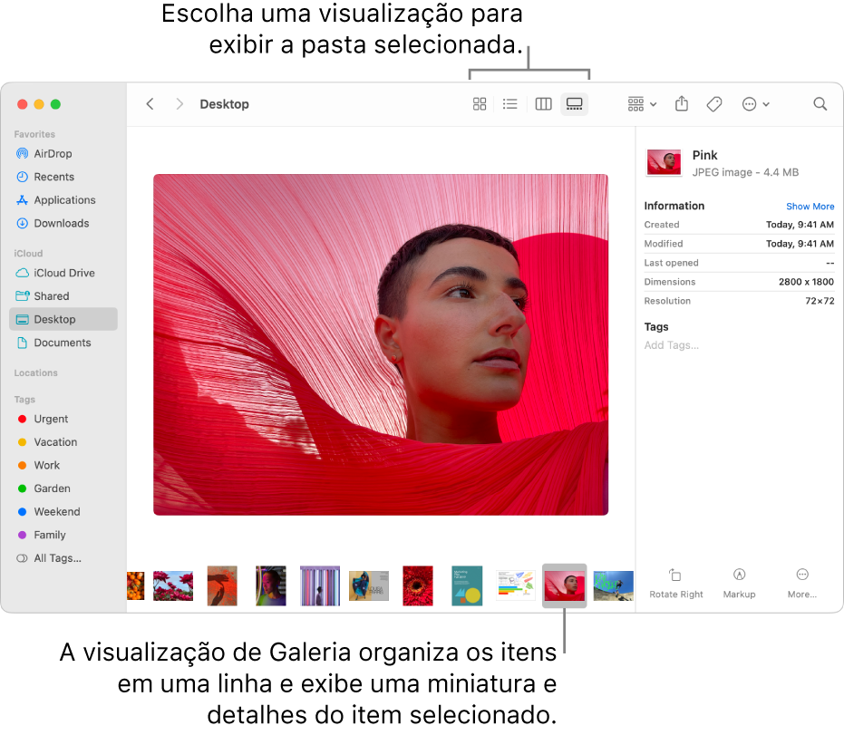 - Em cada visualização, dependendo do tipo de item, você pode realizar ações diferentes com ele. Por exemplo, com imagens na visualização por Colunas ou Galeria, você pode mostrar mais detalhes, adicionar etiquetas ou girar. Para opções adicionais, clique no menu local Ação