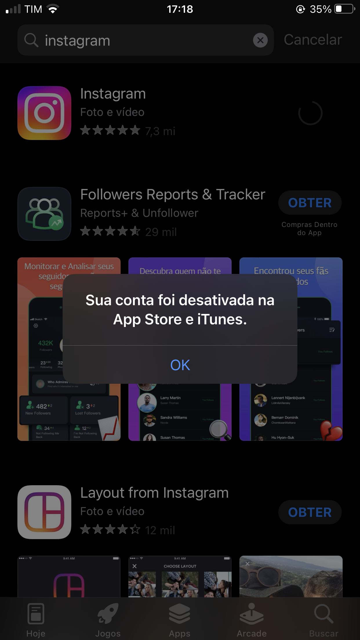 Se você vir uma mensagem informando que sua conta foi desativada na App e na iTunes Store, entre em contato com o Suporte da Apple através do telefone 0800-761-0880 ou através do site: Apple Support (Segunda a sábado das 08 as 20)