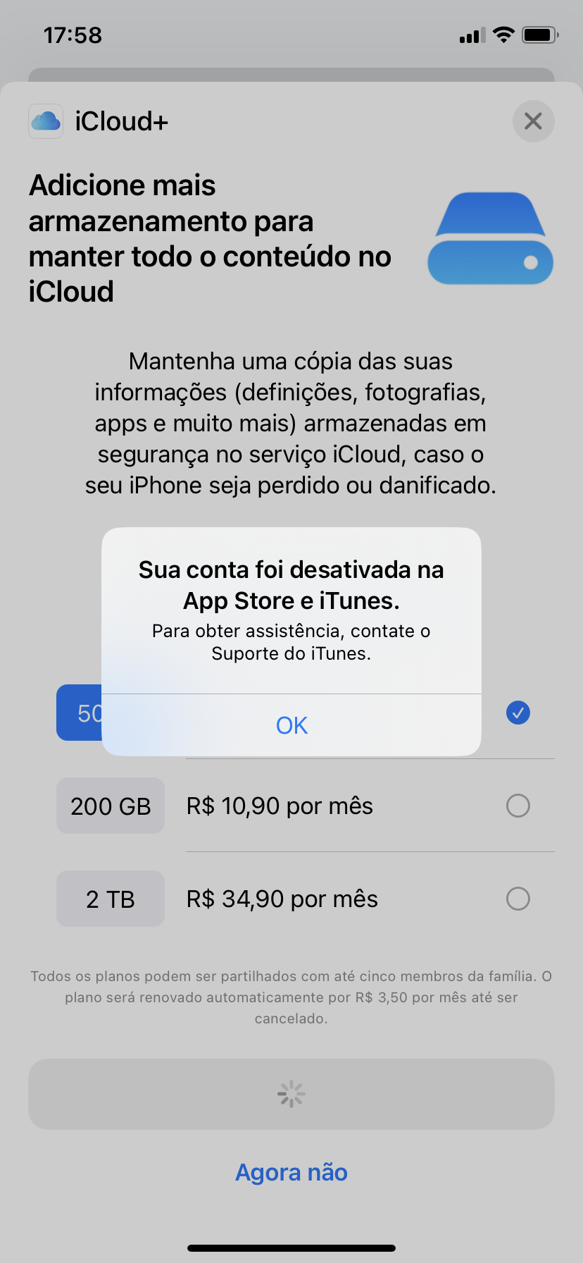 Se você vir uma mensagem informando que sua conta foi desativada na App e na iTunes Store, entre em contato com o Suporte da Apple através do telefone 0800-761-0880 ou através do site: Apple Support (Segunda a sábado das 08 as 20)