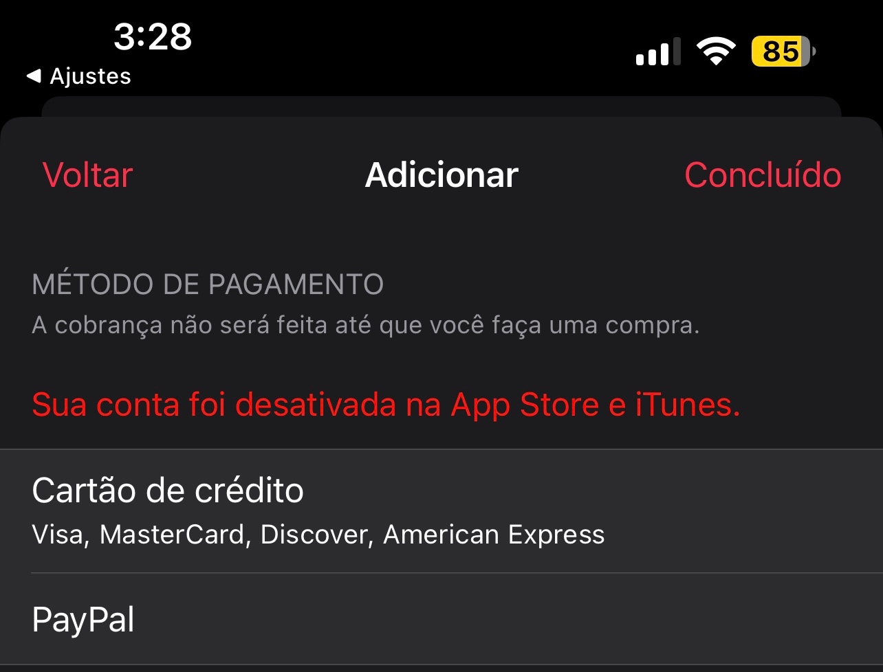 Se você vir uma mensagem informando que sua conta foi desativada na App e na iTunes Store, entre em contato com o Suporte da Apple através do telefone 0800-761-0880 ou através do site: Apple Support (Segunda a sábado das 08 as 20)