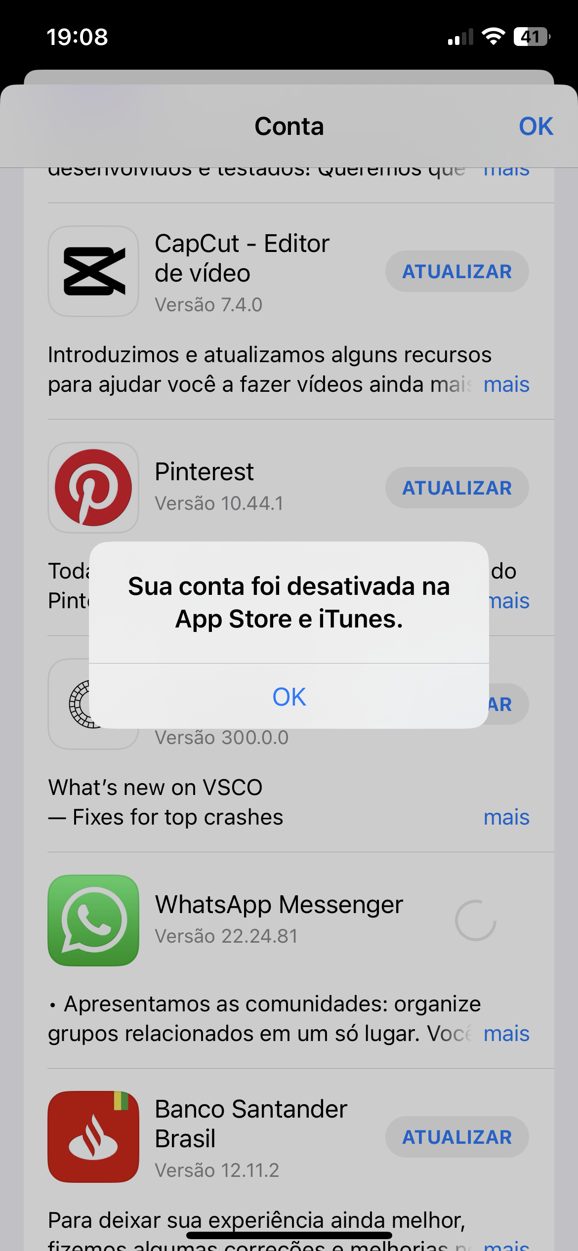 Se você vir uma mensagem informando que sua conta foi desativada na App e na iTunes Store, entre em contato com o Suporte da Apple através do telefone 0800-761-0880 ou através do site: Apple Support (Segunda a sábado das 08 as 20)