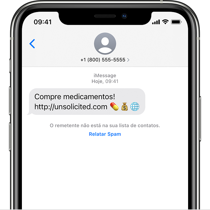 É possível denunciar iMessages que parecem spam ou mensagens indesejadas a partir do app Mensagens. Ao receber um iMessage de alguém que não está salvo nos Contatos, você verá um link "Relatar Mensagem Indesejada" logo abaixo da mensagem.