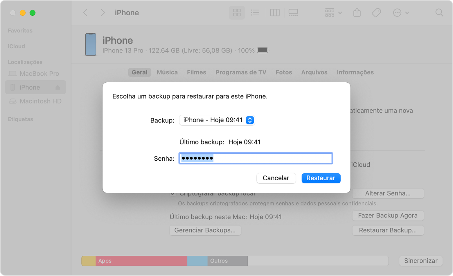 6. Clique em Restaurar e aguarde a conclusão da restauração. Se solicitado, digite a senha do backup criptografado.