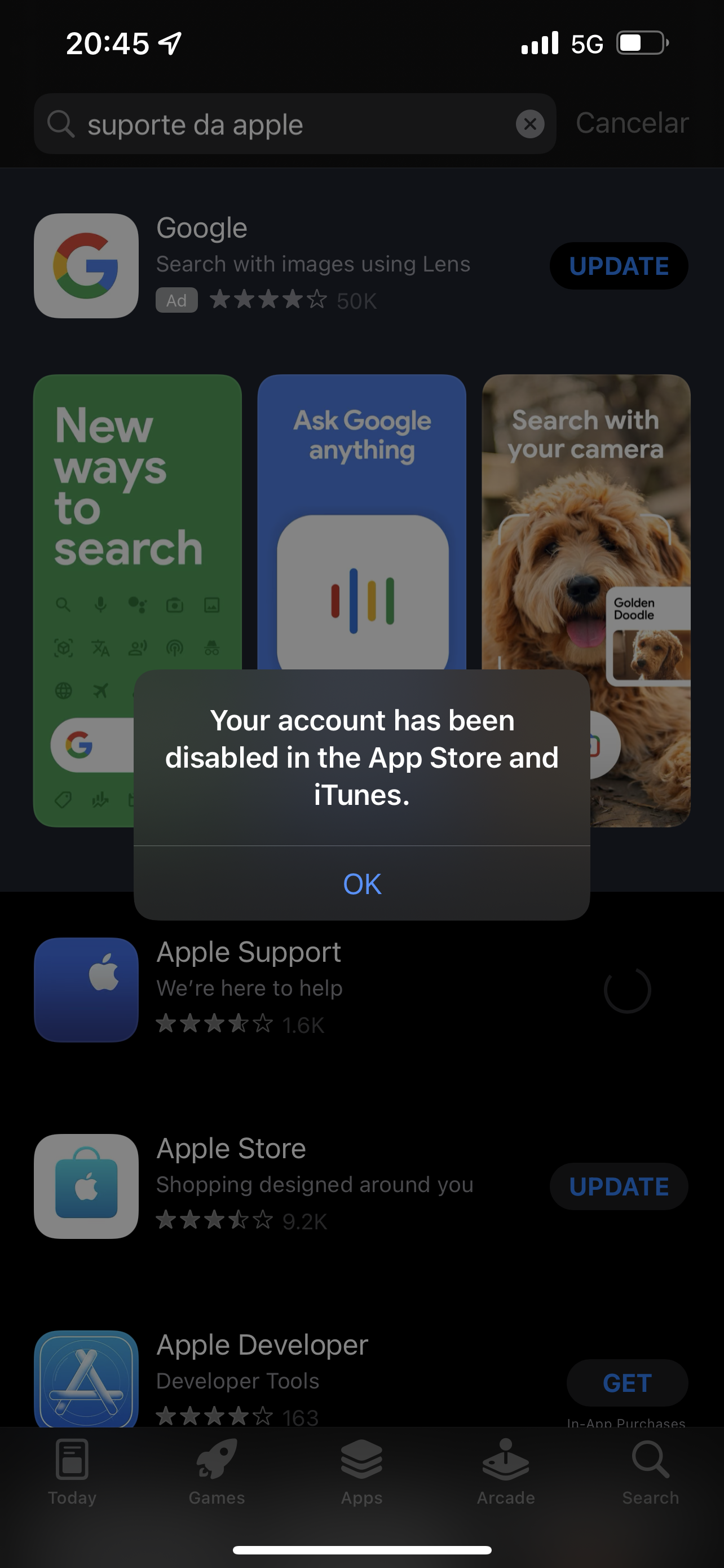 Se você vir uma mensagem informando que sua conta foi desativada na App e na iTunes Store, entre em contato com o Suporte da Apple através do telefone 0800-761-0880 ou através do site: Apple Support (Segunda a sábado das 08 as 20)