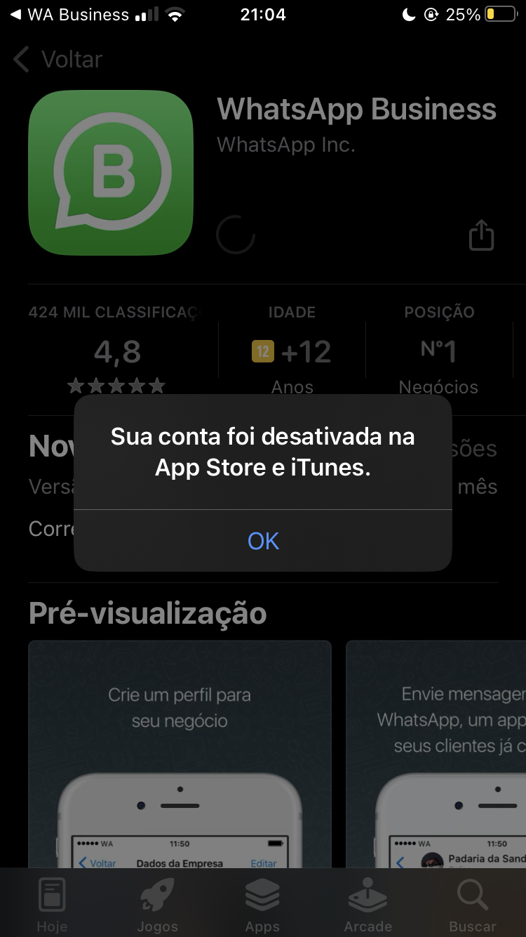 Se você vir uma mensagem informando que sua conta foi desativada na App e na iTunes Store, entre em contato com o Suporte da Apple através do telefone 0800-761-0880 ou através do site: Apple Support (Segunda a sábado das 08 as 20)