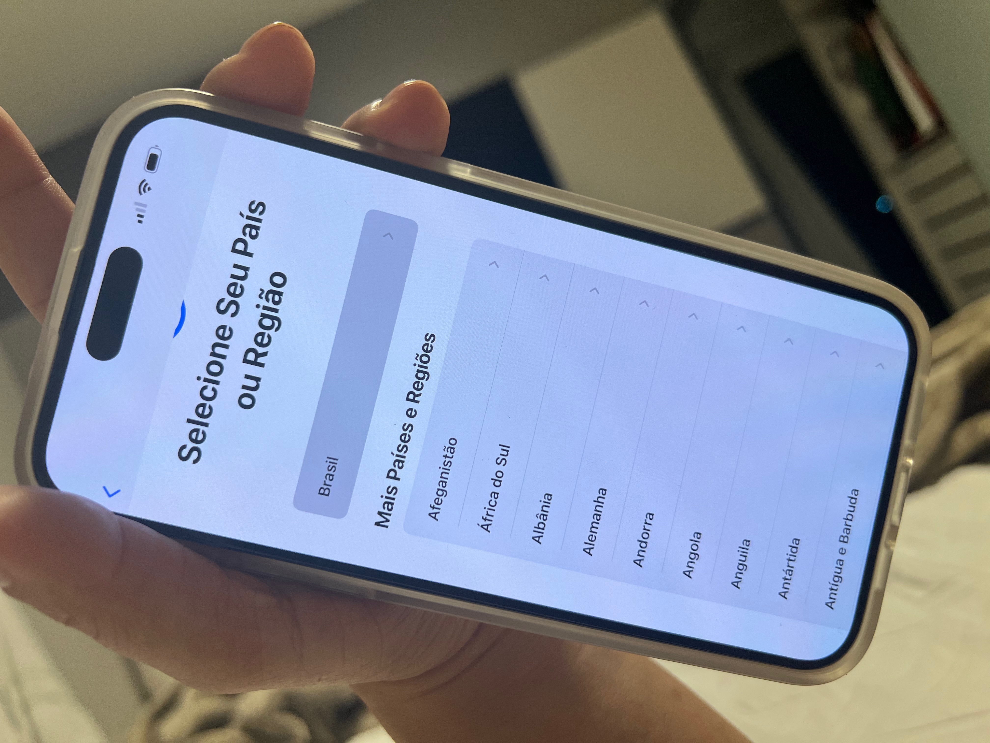 O que eu faço? Meu iPhone 14 travou na transferência e voltou pra tela de início. Aparece escolher idioma e país de lá não sai !