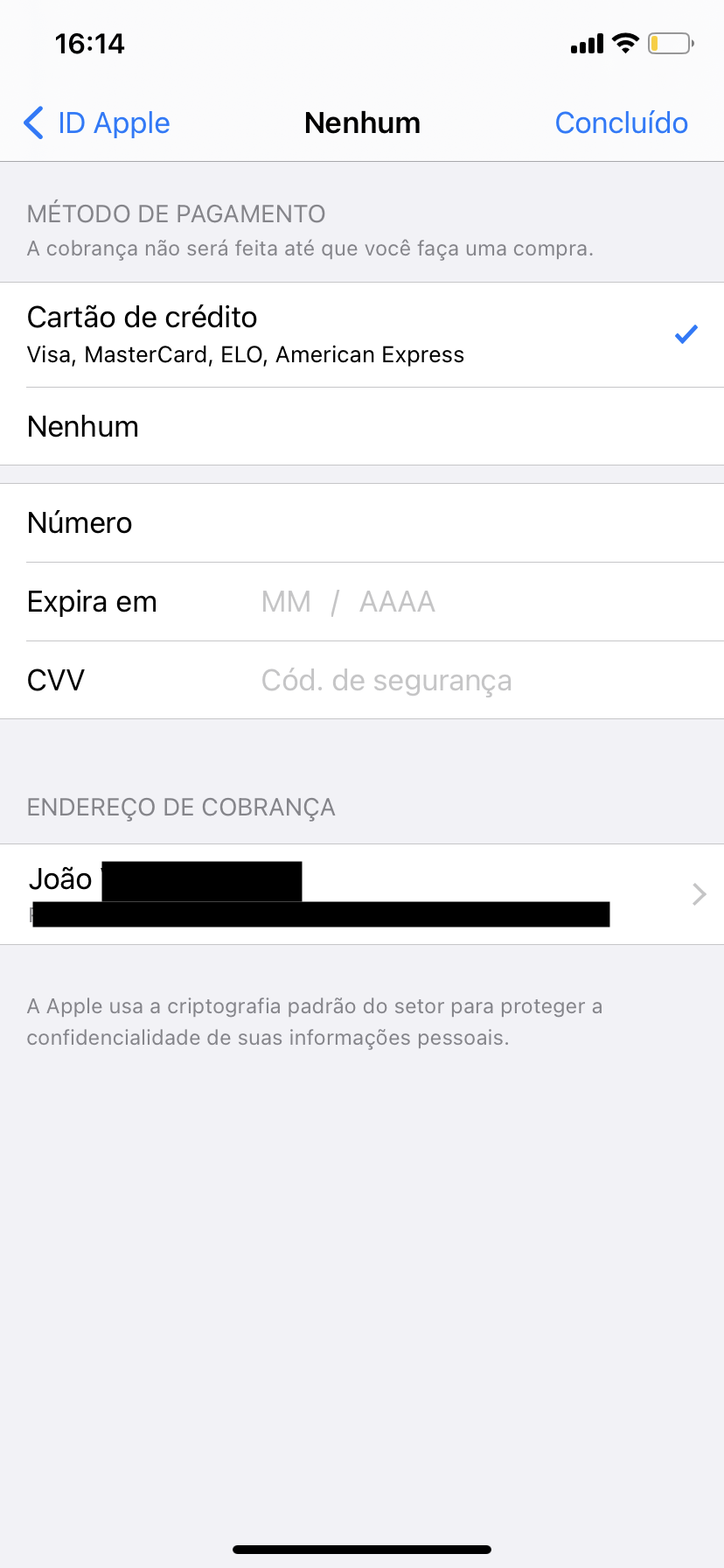 Não estou conseguindo colocar o número do cartão no ID Apple