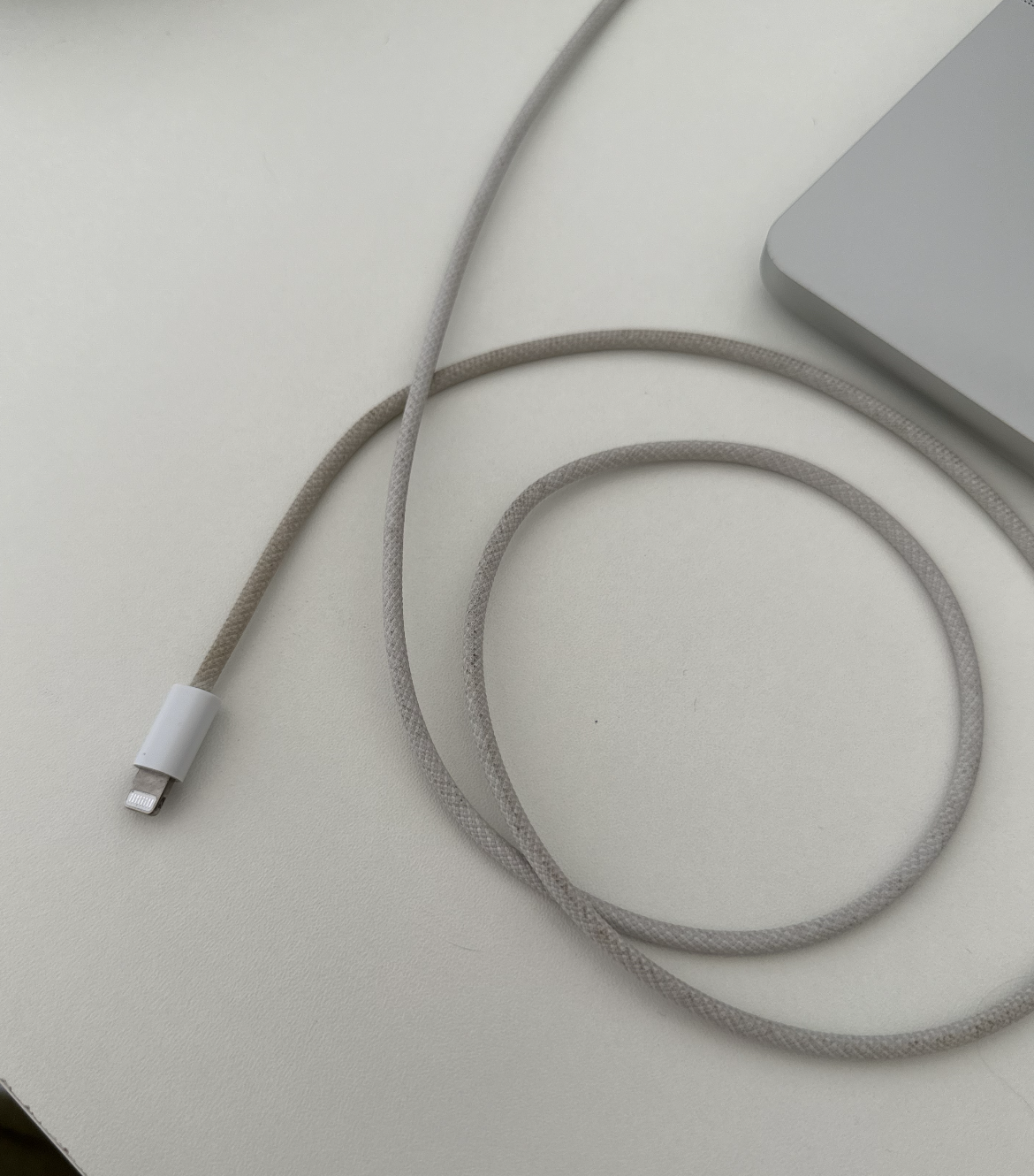 Para limpar o cabo da Apple, desconecte cada extremidade do cabo do dispositivo e do adaptador de alimentação. Em seguida, use um pano macio e levemente umedecido que não solte fiapos para limpar ao longo do comprimento do cabo. Se o cabo ainda não estiver limpo, use um pano macio sem fiapos molhado com água e sabão para limpar todo o cabo. Use um pano seco para limpar o cabo e eliminar qualquer excesso de umidade. Evite qualquer tipo umidade perto de qualquer conector do cabo. Deixe o cabo secar durante a noite antes de usá-lo novamente com o dispositivo.