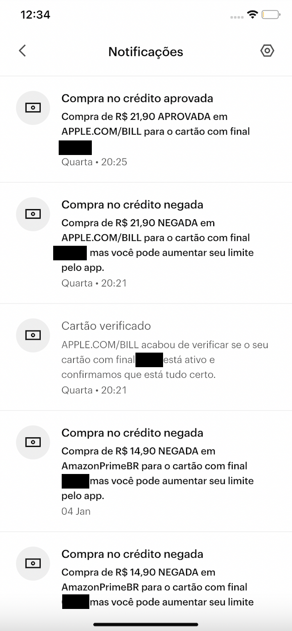 Para saber por que o cartão de crédito, cartão de débito ou outro método de pagamento foi recusado, entre em contato com a instituição financeira. A Apple não tem informações sobre o motivo da recusa do método de pagamento.