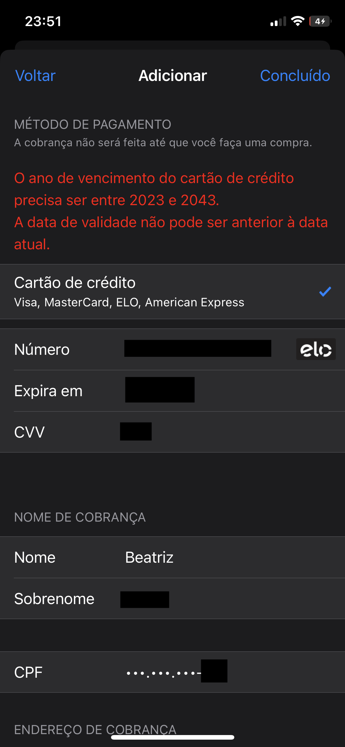 nao consigo cadastra o cartão da que a validade tá incorreta