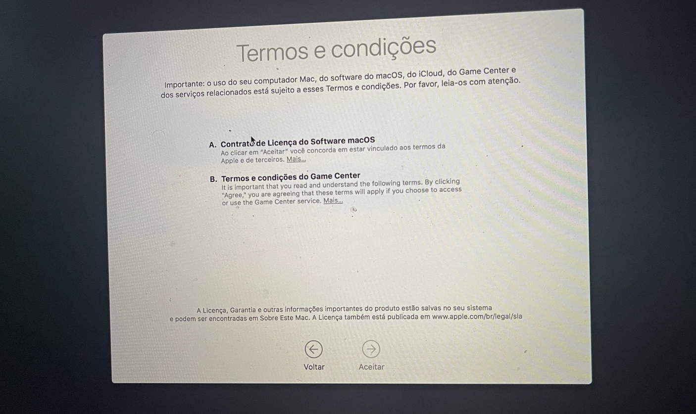 Eu atualizei meu sistema operacional durante a instalação tem a pagina "termos e condições, so que não libera o botao aceitar. Ja rolei ate os final do texto e nao libera igual.. ja voltei e loguei de novo e ainda assim nao libera.