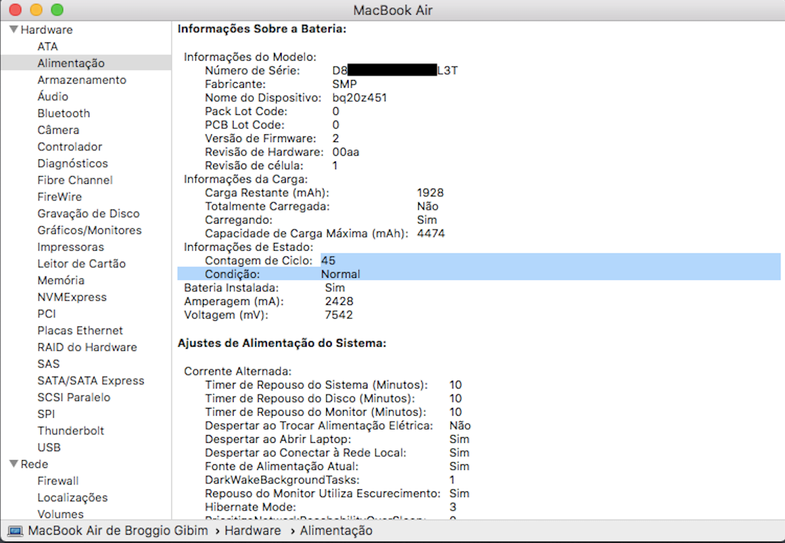 O Meu MackBook Air não fica fora da fonte de energia, já tentei fazer diversos testes. Acontece que ele não acusa nenhum problema na bateria, até a luz laranja que indica carregamento aparece, e quando atinge 100% da bateria ela fica verde e quando eu retiro a fonte de alimentação do MacBook ele desliga... As vezes ele liga sem estar com o cabo ligado na tomada, mas isso é excessão, não é sempre que acontece isso.