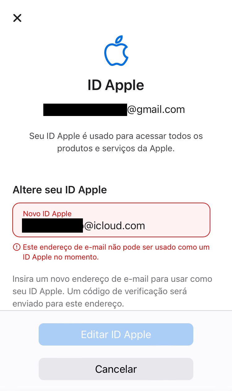 Não consigo definir meu Mail do iCloud como meu Apple ID. Quando tento aparece a mensagem: “Este endereço de e-mail não pode ser usado como um ID Apple no momento.” Alguém pode me ajudar?
