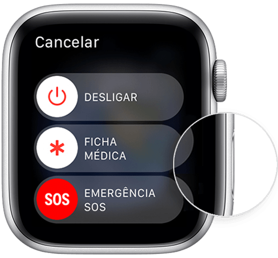 Para forçar a reinicialização do Apple Watch, mantenha o botão lateral e a Digital Crown pressionados por pelo menos dez segundos. Depois, solte os dois botões quando o logotipo da Apple aparecer.