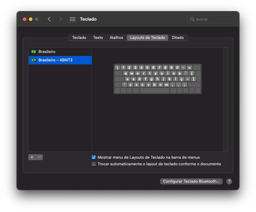 Formato ABNT2 de teclado incorreto no MacOS
