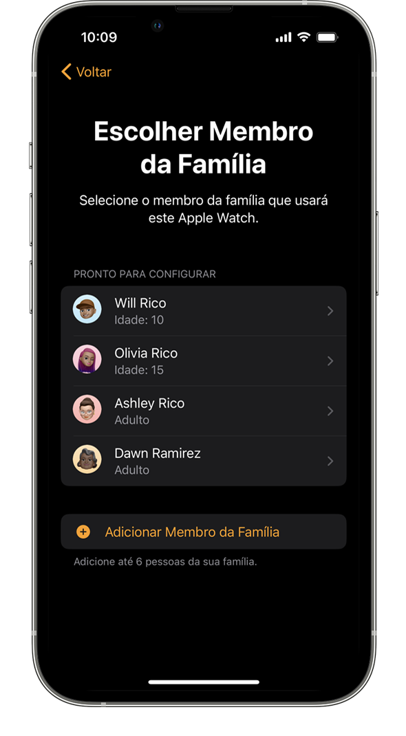 Selecione o membro da família que vai usar o Apple Watch. Se ele não aparecer, toque em "Adicionar Membro da Família".
